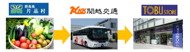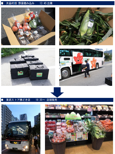 この取り組みは、片品村の農家の人々が生産した朝採れの高原野菜(糖度の高いとうもろこしやトマト等)を「道の駅 尾瀬かたしな」で集荷し、関越交通の高速バス尾瀬号に乗せて運行、終点のバスタ新宿から車庫へ回送する際に東武ストア「勝どき店」へ配送する。