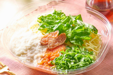 青森県産のながいも「ななこいも」と、明太子、大葉、リーフレタスを盛り付けた冷製パスタ。スープは、出汁の効いた和風ソースに仕上げている。販売エリアは、東北6県。