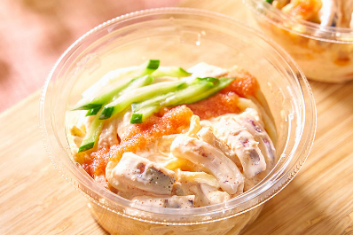 八戸港で水揚げされたイカと、相性の良い明太子を混ぜ合わせた、カップ入りのスパゲティサラダ。販売エリアは、青森県、岩手県、秋田県。