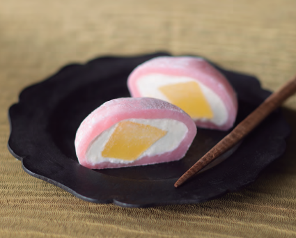 青森県産のりんごのコンポートを、ごろっとしたサイズにカットし、酸味のあるクリームチーズを合わせたフルーツ大福。販売エリアは、東北6県。