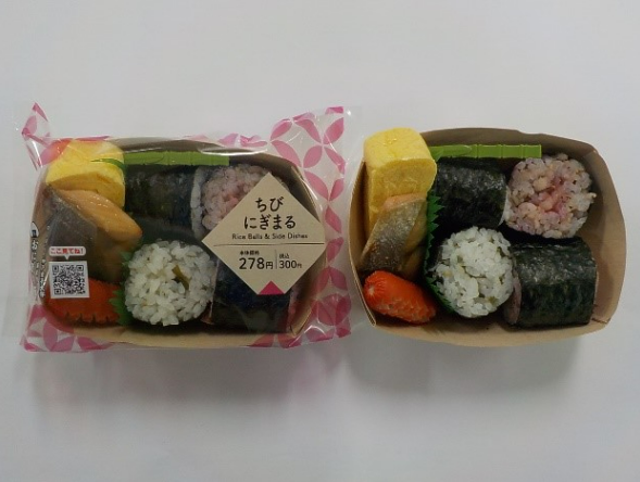 今回の商品は「朝食改善プロジェクト」の一環として、時間のない朝でも手を汚さずに食べやすく、色々なおかずを手軽に取ることができるおにぎりセットになっている。手を汚さないように、おかずにピックをつけた。梅しそ味とわかめ味の2種類の一口サイズのおにぎりに、だし巻玉子、鮭、赤ウインナーといったお馴染のおかずを盛り付け、朝ご飯にちょうど良いサイズに仕上げた。
