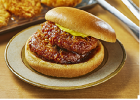 チキンカツを2枚サンドしたボリューム感のあるハンバーガー。ソースは、半田屋で「仙台味噌カツ丼」に使用していた仙台味噌だれを使用している。275円。