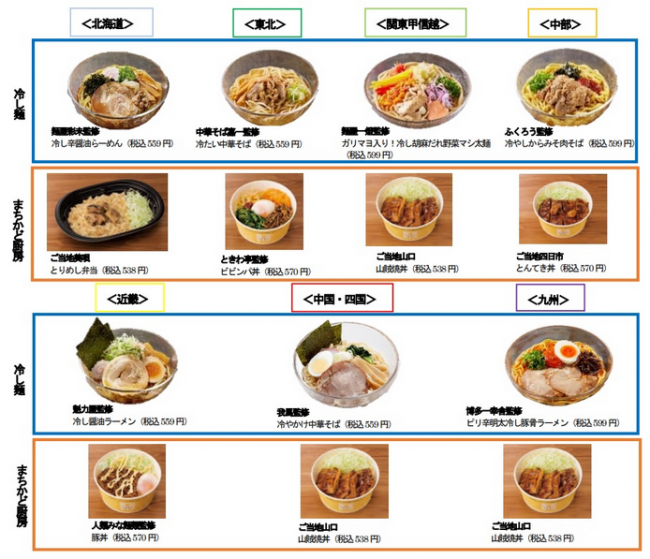 (株)ローソン(東京都品川区、竹増貞信社長)は7月26日(火)から、全国7エリアで、人気ラーメン店が監修する冷し麺や、店内キッチンで調理する「まちかど厨房」のご当地メニューの商品をエリア限定で発売する。