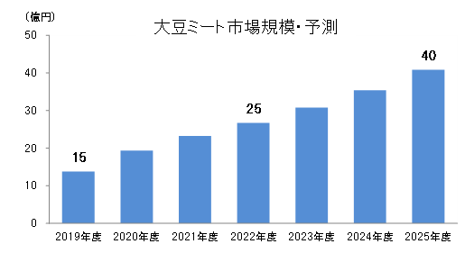 大豆ミートは「第4の肉」とも呼ばれる植物性の代替肉で、 “低カロリー・低脂質・高たんぱく”という特徴から注目を集めている。家畜の飼育・食肉の生産は環境に悪影響を及ぼすとされ、環境への配慮から大豆ミートを購入する消費者も増えている。大豆ミートの国内市場は、日本能率協会総合研究所によれば、2020年度の20億円に対し、2025年度は2倍の40億円に拡大すると予測され、小売り、メーカー各社が商品開発に力を入れている。