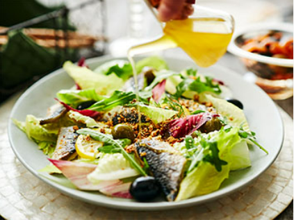 シチリア郷土料理「ベッカフィーコ(イワシのパン粉焼き)」をイメージした。コンフィしたイワシに、ベーコンチーズパン粉をまとわせ、香ばしさを演出。心地よい酸味のシチリアレモンドレッシングで。