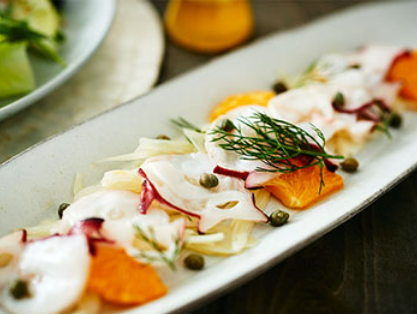 タコ足を薄くスライスし、ケッパーとフェンネルでマリネした。とても香りがよく、オレンジの爽やかな甘みも食欲をそそる。