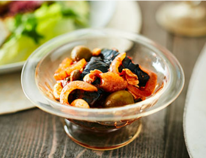 シチリア郷土料理の代名詞。香り豊かなオリーブオイルを使った、揚げ茄子の甘酢煮と絡み、絶妙な旨みが生まれる。地中海の太陽のように元気をくれる料理。