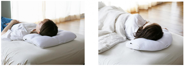 今回発売する「deep sleep PILLOW」は、仰向け寝と横向き寝の2種。西川が行ったアンケート調査で、寝つき時の寝勢について仰向け寝と横向き寝が二分することが判明し、2種同時に展開することとした。仰向け寝と横向き寝に最適な枕を徹底的に追求し、どちらのタイプも首・肩口にやさしくフィットするアーチ型形状で、通気性の良いソフトパイプが頭部・頸部をしっかりサポートする。