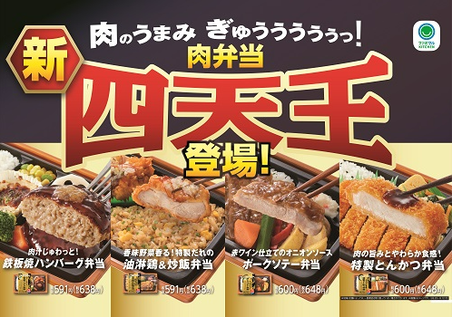 ファミリーマートでは、2022年2月に「肉弁当 四天王」として、美味しさに加えて、見た目や彩りにもこだわったボリュームたっぷりの弁当を4種類発売し、多くのお客に好評を得た。今回、ソースのリニューアルや、新メニューを加え「【新】肉弁当 四天王」として、次の4種類の弁当を発売する。