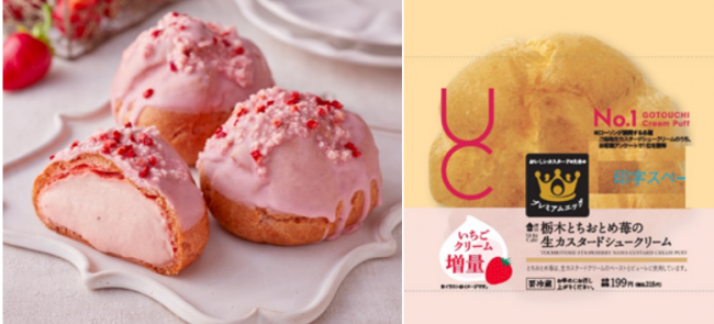 「栃木とちおとめ苺の生カスタードシュークリーム」は、「生カスタードシュークリーム」のカスタードクリームに、栃木県産「とちおとめ」のいちご果汁とピューレを合わせている。生地にはドライストロベリー、いちごコーティングしたクランチをトッピングし、食感のアクセントを楽しめるようにした。さらに、今回販売エリアを拡大するにあたり、いちごクリームを増量し、よりいちごの濃厚な味わいを楽しめるように仕立てている。