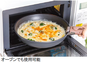 新商品では、フライパン内面のコーティングをより厚くし、塗布時の焼成温度にもこだわることで、高温の強い水流で汚れを落とす食洗機での洗浄が可能になった。さらに、フライパンの表面を固くし、丈夫でさびにくくするため、特殊な加工を施した。外面には耐熱塗料を使用しているため、オーブン調理も可能だ。調理の下ごしらえから片づけまで、調理に関わるあらゆる工程で便利に楽に使用できる、まさに「楽カジ」な商品だ。