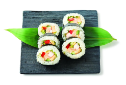 100%植物由来の「NEXTツナ」を、アボカド、パプリカ、サニーレタスなどど一緒に仕立てた海苔巻き。代替ツナの独特の風味が和らいでいて食べやすい。