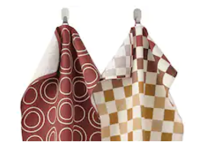 キッチンクロス2枚のセット。1枚はブラウンの生地にホワイトの円、もう1枚はオータムカラーの四角い柄が入っている。