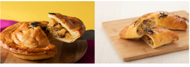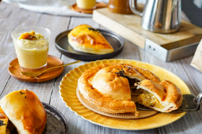 半世紀以上にわたり作り続けている大人気のロングセラー商品「紀ノ国屋 アップルパイ」を参考に開発した、さつまいもがぎっしりと詰まったパイ。皮まで甘く風味豊かな金蜜芋を余すことなく楽しめるよう、皮付きのままゴロッと大きめにカットした金蜜芋の焼き芋をたっぷりと混ぜ込んだペーストを、さっくりしっとり食感のパイ生地で包み込んだ。価格は5号で918円(税込み、以下同じ)、1個で302円。