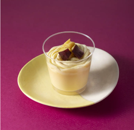 なめらかな舌触りの焼き芋プリンに、金蜜芋あんこを練り込んだ焼き芋ホイップクリームを重ね、ダイス状にカットした金蜜芋の焼き芋をトッピングした、さつまいも尽くしのモンブラン。プリンとホイップクリームの2層仕立てとなっている。価格は410円(税込み)