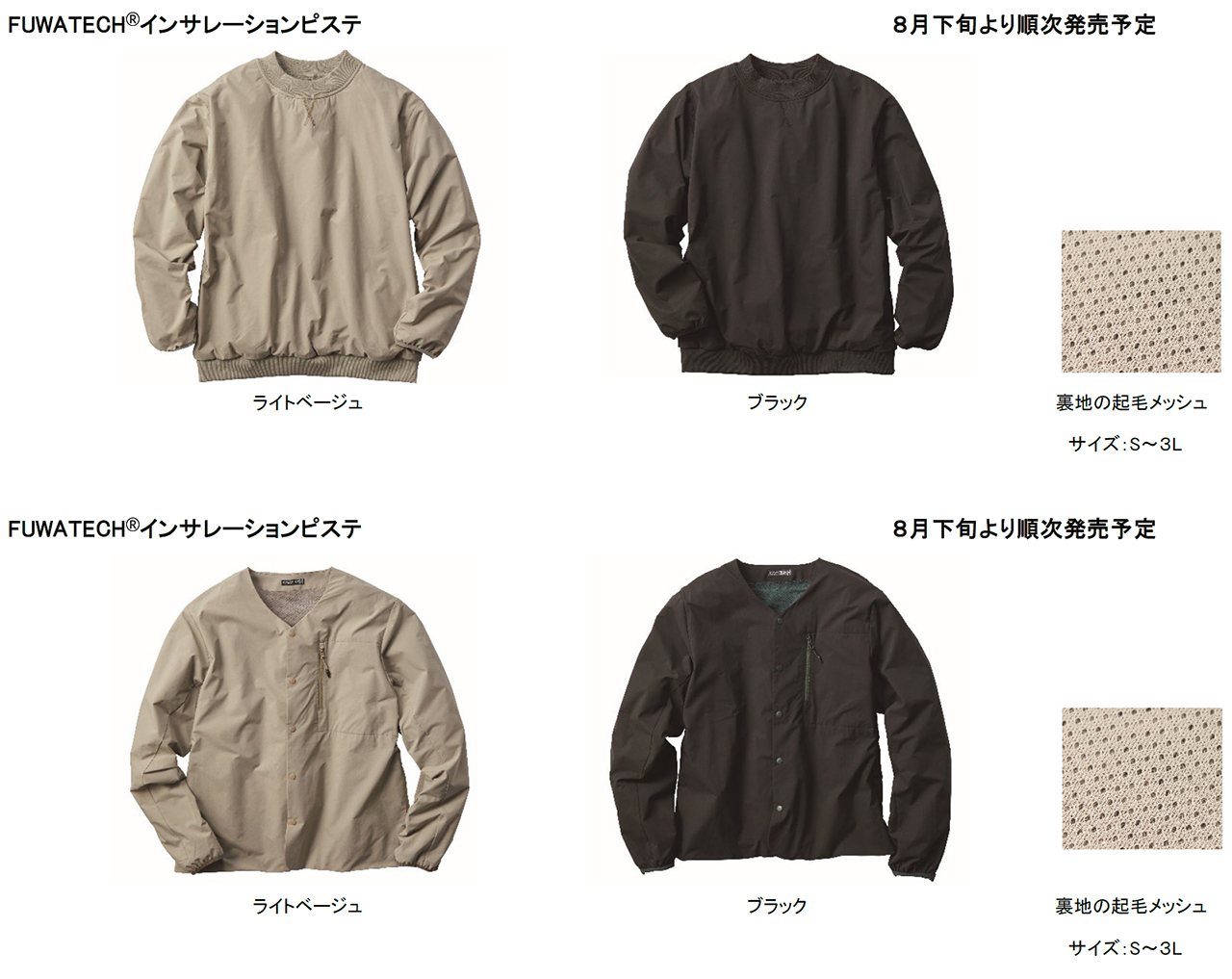 表地はSOLOTEX®、裏地にはFUWATECH®️を採用した軽量の高機能ウェア。インサレーションピステは1900円、インサレーションカーディガンは2500円。