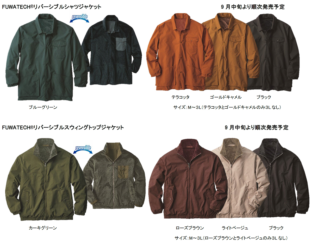 表側で着るとタウンウェアだが、裏返すとアウトドアウェアになる。表側はSOLOTEX®、裏側にはFUWATECH®️を採用している。帝人フロンティアのSOLOTEX®は①軽量、②耐久性、③型崩れしてもハンガーにかけるだけで復元できる、④毛玉になりにくい、という特徴があり、地球環境にやさしい植物由来の原料を一部に使用している。FUWATECH®️には超軽量、高い保温性、包み込むような柔らかさ、という特徴がある。シャツジャケット・スウィングトップジャケットはともに2900円(税抜き、以下同じ)、カーゴパンツは2500円。