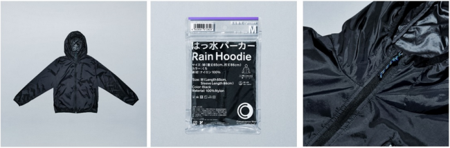 新商品の「はっ水パーカー」は、小松マテーレ社の超耐久撥水素材「ダントツ撥水®」を使用することで、撥水性、耐久性を実現している。デザインはシルエットにもこだわり、ファスナー部分にはファミマオリジナルパーツを使用している。パッカブル仕様になっているため、小さくたためてコンパクトに持ち運びできる。カラーは黒でM/Lの2サイズ。