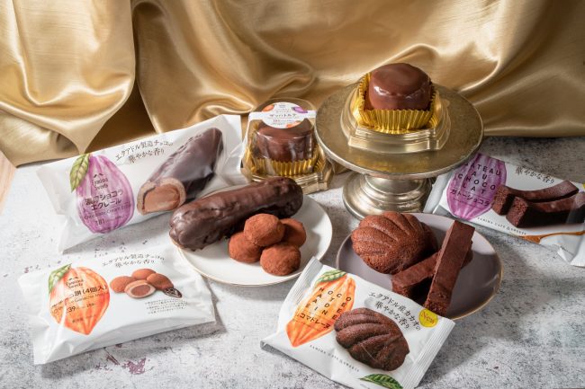 「エクアドル・スペシャル」を使ったスイーツや焼き菓子は、2020年10月に発売。シリーズ累計販売数は3400万個を突破している。発売2周年を機に、とくに人気を博した「ザッハトルテ」、「濃厚ショコラエクレール」181円と、リニューアルの「ガトーショコラ」230円、そして新商品「チョコマドレーヌ」167円を発売する。