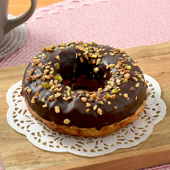 クロワッサン生地とドーナツのハイブリッドパン。ファミリーマートオリジナルチョコのコーティングの上に、アーモンドとピスタチオをトッピングし、チョコクリームをサンドした。