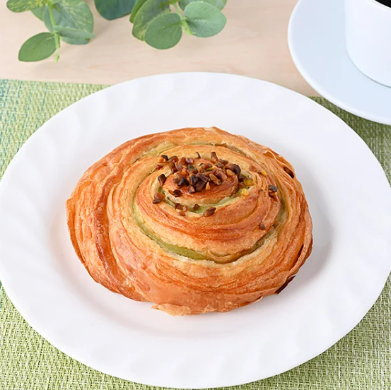 ブルターニュ産の発酵バター入り油脂を折り込んだデニッシュ生地に、ピスタチオクリームを巻き込み、クラッシュしたピスタチオをトッピングした。