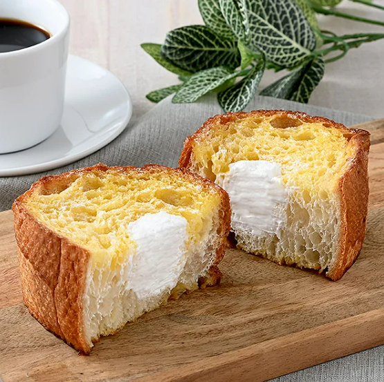 分厚くスライスした歯切れのよいフランスパン生地に、フレンチ液を染み込ませ、コクのある発酵バター入りのホイップを入れた。