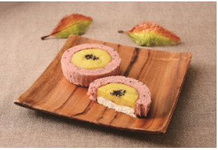 紫芋ペーストを練りこんだスポンジ生地で、紅はるかの焼芋ペーストを使用した“芋クリーム”、北海道産生クリームを配合した“ホイップクリーム”、強い甘みとコクが特長の三温糖をあわせた“蜜ソース”をとじこめた。ほくほくとした食感と濃厚な味わい、とろりとした蜜ソースが楽しめる一品。スポンジ生地に黒ごまをあわせ、食感と香りにアクセントをつけた。