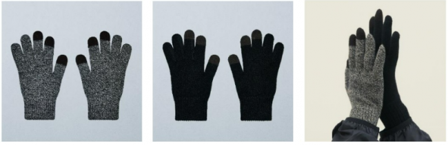 ウール混素材を使用し、内側が起毛仕様になっている。親指、人差し指部分はスマートフォンにも対応する。カラーはグレーミックス・黒。価格は1650円