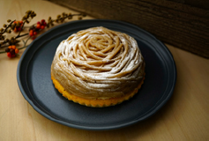 茨城県産新栗のペーストを使用し、セントラルキッチンのパティシエの工夫を凝らしたモンブラン。自家製のジャンドゥーヤは、この商品のために開発した。ジャンドゥーヤは、焙煎したナッツ類のペーストとチョコレートとの混合物。1070円。
