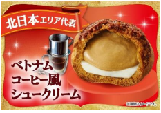 ベトナムコーヒーの味をコーヒーカスタードクリームと練乳カスタードクリームで再現。コーヒーの苦みと練乳の甘さが絶妙にマッチする。また、コーヒー入りクッキーシュー生地にすることでコーヒーの風味を楽しむことができる。