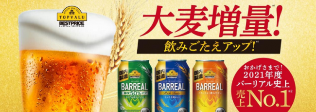 イオン(千葉市美浜区、吉田昭夫社長)は新ジャンルビールの「トップバリュベストプライス バーリアル」シリーズをリニューアルし、全国の「イオン」「イオンスタイル」など約1万店舗で10月11日(火)から販売を開始した。