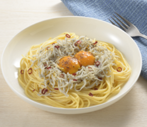 「伊達なしらす」をたっぷりのせた、にんにく・アンチョビの旨味とオリーブオイルの風味が引き立つペペロンチーノに、卵黄風ソースを合わせ、マイルドでコクのある味わいに仕上げた。