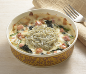 マカロニに濃厚なホワイトソースを合わせ、ベーコン・ほうれん草・チーズをトッピングし焼き上げた。「伊達なしらす」をたっぷりトッピングし、海の風味も楽しめる。