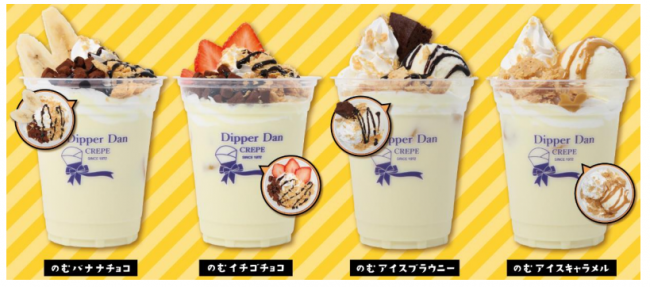 商品は、のむバナナチョコ、のむイチゴチョコ、のむアイスブラウニー、のむアイスキャラメルの4種類で、各480円(税込み)。ミルクセーキをベースにディッパーダンのクレープをイメージした特別な配合のドリンクに、クレープではお馴染みのホイップ、フルーツやアイス等のトッピングでデコレーションした。見た目もクレープのようなドリンクに仕上げた。