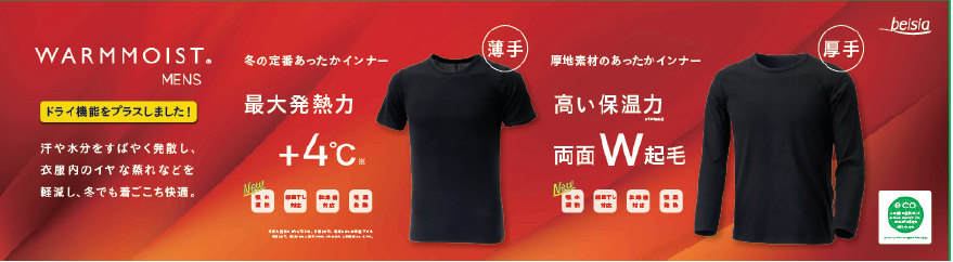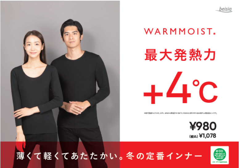 (株)ベイシア(群馬県前橋市、相木孝仁社長)は、新しくドライ機能を追加した秋冬シーズンのインナー「ウォームモイスト」を発売する。衣料品取り扱い店舗87店舗で10月19日(水)から販売する。