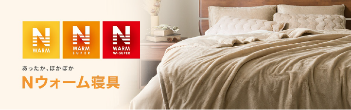 「Nウォーム」は、吸湿発熱、蓄熱⽣地を使⽤した秋冬向けの定番寝具。今年モデルには⾼⽔分率⽷を採⽤し、保湿機能を追加した。軽くて温かい、Nウォームのスタンダードモデル。