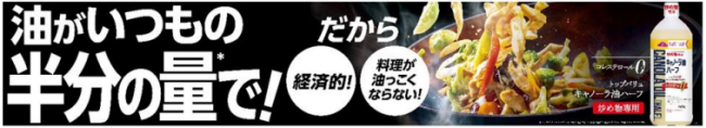「トップバリュキャノーラ油ハーフ(炒め物専用)」は、食材内部への油の浸透がしにくい特性から、フライパンに油が残りやすく、食材の周りに油がなじみやすい仕様になっているため、炒め物で使用する量がいつもの半分で済む。油っこくなくヘルシーな料理に仕上げられるうえ、使用量を減らすことができる。購買頻度を減らすことができる家計に優しい商品になっている。