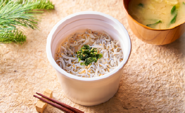宮城県の新名物「北限のしらす」を使用した。しらすが採れる最北端、名取市閖上で水揚げされた、しらす本来の味わいが楽しめるミニしらす丼。価格は370円、販売エリアは宮城県。