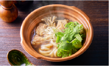 仙台名物「せり」の風味や食感が味わえる、鍋惣菜。鶏の自然な旨みと風味が感じられるスープに、鶏肉やきのこ、うどんを合わせた。価格は650円、販売エリアは宮城県。