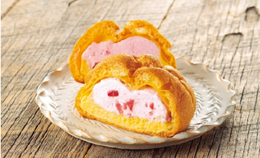 宮城県産の苺を加えたホイップとカスタードクリームを合わせたシュークリーム。苺の風味や果肉感を感じられるホイップに仕上げた。価格は180円、販売エリアは宮城県、青森県、秋田県、岩手県、山形県。