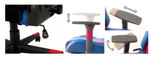 左:座⾯昇降操作レバー 右:肘は上下、前後、左右に調節可能