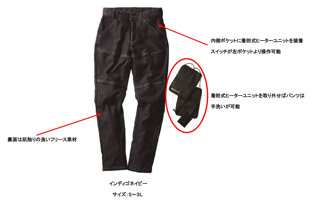 ウィンドコアヒーターシリーズに初のデニムパンツ。着脱式ヒーターユニットを取り外すとパンツの手洗いが可能になる。4900円。