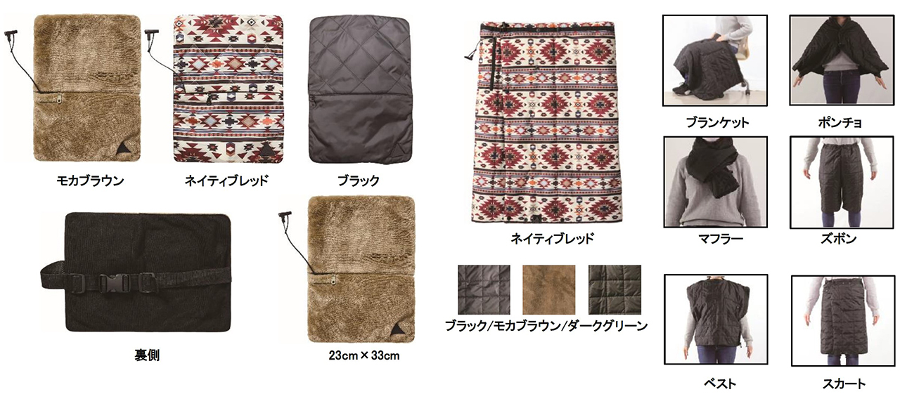 使い方次第で温めたい場所をダイレクトに温めるられるマルチパッドとマルチブランケット。マルチブランケットはシーンに応じて6通りに使い分けることができる。マルチパッドは1900円、マルチブランケットは2900円。