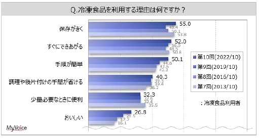 冷凍食品を利用する理由は(複数回答)、「保存がきく」「すぐにできあがる」「手順が簡単」が利用者の各50%台、「調理や後片付けの手間が省ける」が40.3%、「少量必要なときに便利」が32.3%となっている。過去調査と比べて、「おいしい」が増加傾向にある。利用頻度が「ほとんど毎日」「週4~5日」の層では、「少量必要なときに便利」の比率が高くなっている。