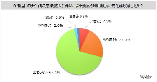 新型コロナウイルス感染拡大によって、冷凍食品の利用頻度に変化があったかを聞いた。利用頻度が増えた人は3割弱で、減った人(約3%)より多くなっている。「変わらない」が67.1%。