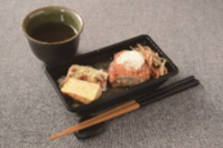 白身魚のフライ、ちくわ磯辺揚げ、 玉子焼きがおかずに入った、お手軽サイズながら具沢山の弁当。もち麦ごはんを使用しており、食物繊維も摂れる。322円。