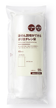 「湯せん調理ができるポリエチレン袋」は、食品の冷蔵や冷凍保存のほか、湯せん調理に使用できる。一般的には箱のパッケージに入ったものが多いが、枚数が減った時に省スペースで保管できるよう、PP袋でのパッケージにしている。また、ロールタイプにしたので、何枚か重なって出てきてしまうストレスがなく、1枚ずつ取り出せる。40枚入り(タテ35cm、ヨコ25cm)で99円(税込み、以下同じ)。