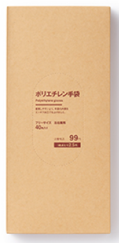 「ポリエチレン手袋」は、手袋の内側をエンボス加工にしたので、さらさらとしていて着脱しやすい。フリーサイズなので、左右どちらの手にも使用できる。箱の横に購入の際、サイズの参考になる目盛りを入れている。掃除や調理、園芸やペットの世話や介護など、さまざまなシーンで活用できる。フリーサイズ(左右兼用)、40枚入りで99円。
