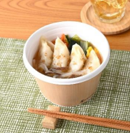 つるもち食感の水餃子と、春雨、もやし、人参、チンゲン菜、きくらげ、玉子を盛りつけた食べ応えのある中華スープ。「丸鶏だし」をベースに醤油やごま油の香りを効かせ、もろみでコクと深みを出した、シンプルながらも旨みのあるスープに仕上げた。428円。