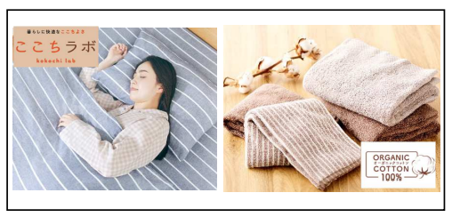 オーガニックコットンを使用した“お肌に、地球にここちよい商品”。寝具・インテリア商品は、オーガニックコットンを 100%使用している。バスタオル 979円、2枚組フェイスタオル 759円、枕カバー 539円、掛けふとんカバー1969円、BOXシーツ 1419円。